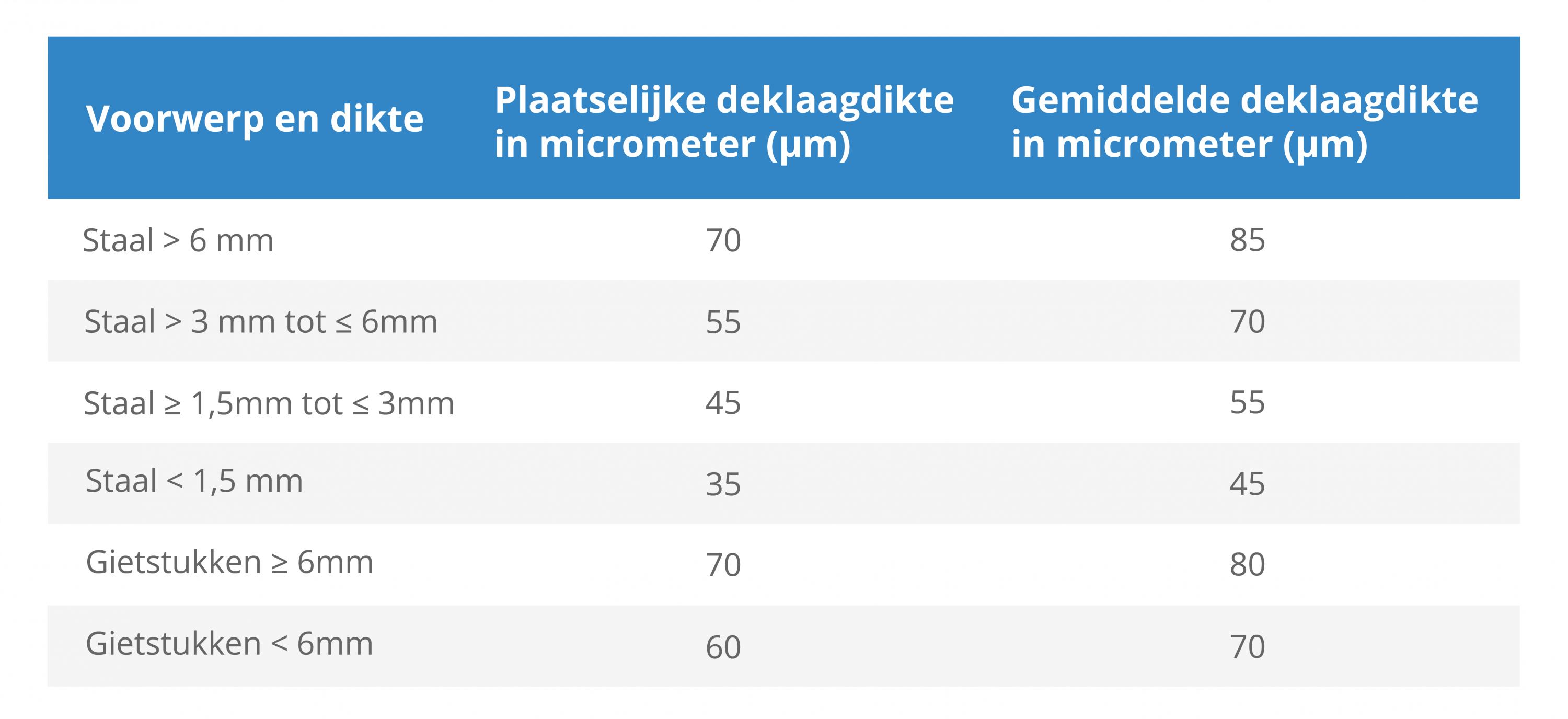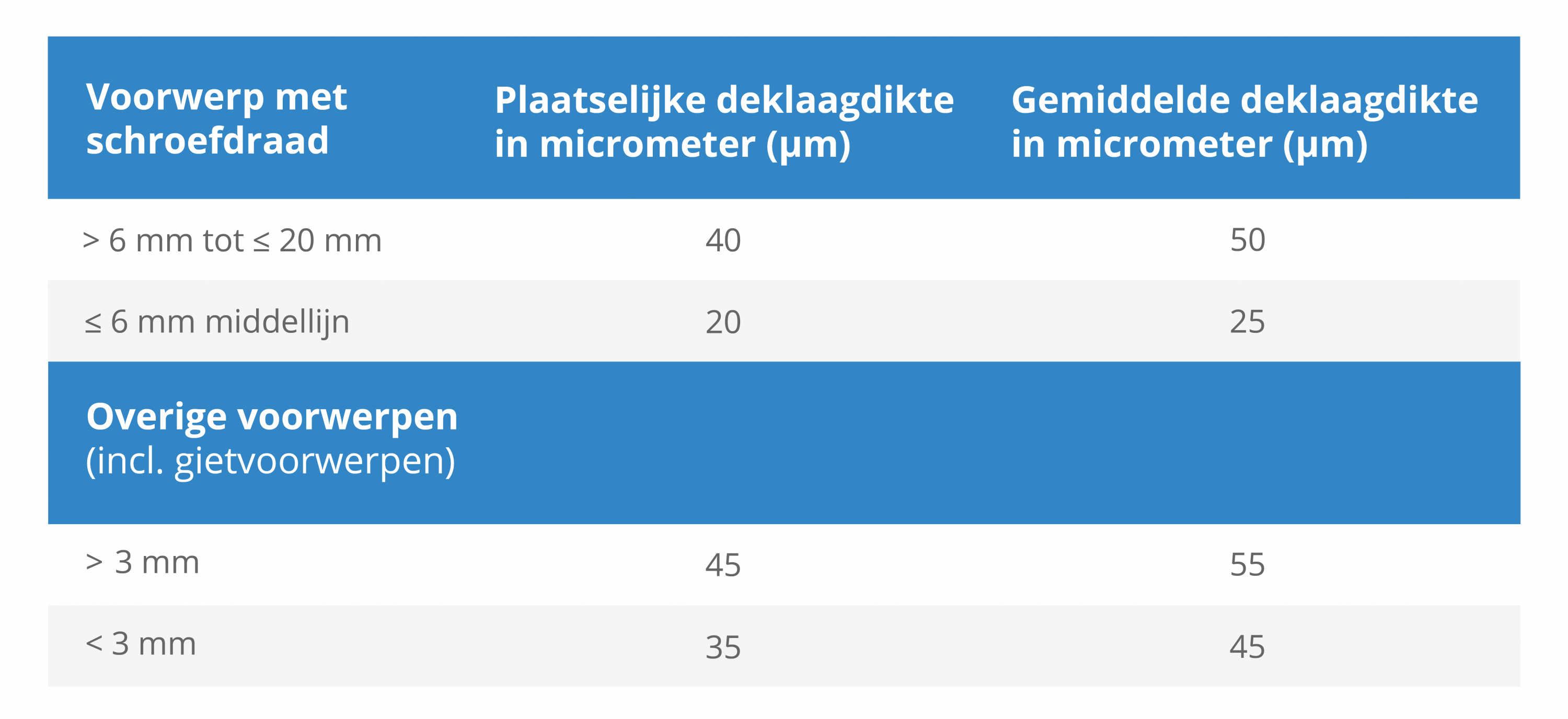 Deze tabel geeft de minimale plaatselijke gemiddelde zinklaagdiktes aan die gehaald moeten worden volgens NEN-EN-ISO 1461.