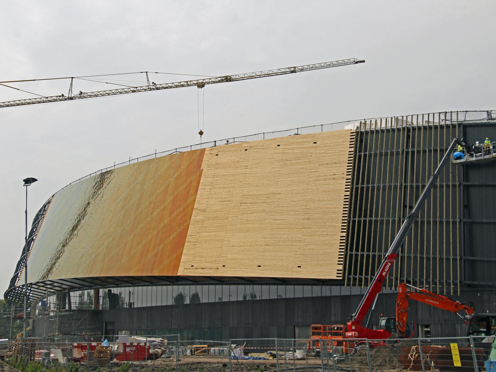 Vervolgens worden hierop houten delen bevestigd waarna er een rvs-beplating op wordt gemonteerd. Deze rvs-beplating doet denken aan een golvend turnlint en zorgt voor een dynamisch en speels effect.